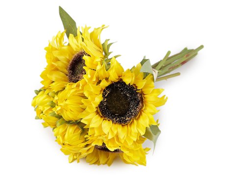 Zväzok umelých slnečníc vynikne vo váze, v kvetinových väzbách, jesenných aranžmánoch a jednotlivé stonky s kvetmi môžete zakomponovať aj do dekoračných vencov. Slnečnice sú pôsobivo zafarbené. Vnútri stoniek je drôt. Vo zväzku je 8 stoniek - 3 malé puky a 5 veľkých kvetov.