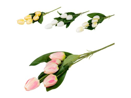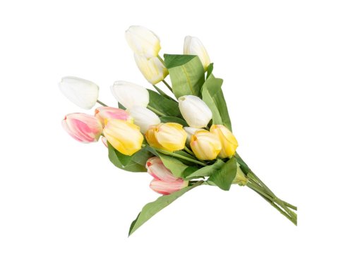 Realisticky spracovaný zväzok piatich umelých tulipánov s dĺžkou 830 mm v pestrom mixe farieb. Vďaka kvalitnému plastovému prevedeniu pôsobia kvety veľmi prirodzene a dlhodobo si udržujú svoj tvar aj farby. Skvelé pre veľkonočnú aj jarnú výzdobu, ale aj ako elegantná dekorácia do domácnosti po celý rok. Bezúdržbová alternatíva živých kvetov, ktorá nikdy neuvädne. Tovar je dodávaný v mixe. Doručovaný tovar je vyberaný náhodne a nie je možné vybrať konkrétne prevedenie.