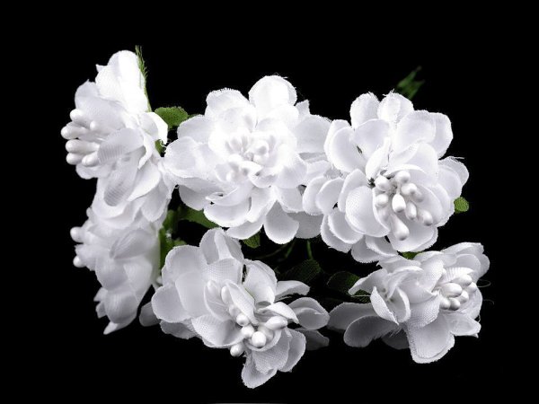 Textilné kvety skvele dozdobia vaše kvetinové dekorácie a aranžmány. Sú detailne prepracované a ozdobené drobnými pestíkmi. Jednotlivé kvety sú pripevnené k ohybnému drôtiku omotanom floristickou páskou, ktorý umožňuje jednoduchú manipuláciu a ľahkú tvarovateľnosť. Použitie: Kvety využijete pri výrobe svadobných dekorácií alebo na ozdobenie čeleniek do vlasov, vencov, apod. 6 kusov kvetov je spojené do zväzku.