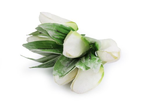 Umelé vintage tulipány s listami sú pripevnené k ohybnému drôtiku omotanom floristickou páskou, ktorý umožňuje ich ľahkú manipuláciu a ľahkú tvarovateľnosť. Využijete ich na výrobu svadobných dekorácií, voničiek alebo na ozdobenie čeleniek do vlasov, vencov, apod.