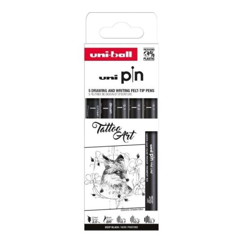 Kombinovaná sada linerov s rôznou šírkou a typmi hrotov vhodné na technické kreslenie, precízne ilustrácie a nápisy. Hodí sa na použitie na klasický alebo pauzovací papier. Inšpirujte sa tvorbou Naoko, @naokotattoo, ktorá je autorkou kresby na prednej strane. Pre viac tipov a odporúčaní skúsených umelcov naskenujte QR kód na zadnej strane krabičky. • 3 × liner, šírka stopy: 0,1; 0,2; 0,7 mm • 1 × liner, štetcový hrot (brush) • 1 × liner, zrezaný hrot 3,0 mm • čierna farba • viečko s klipom • svetlostály a vodeodolný atrament • vhodné na: technické kreslenie, ilustrácie, kaligrafiu a nápisy
