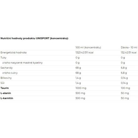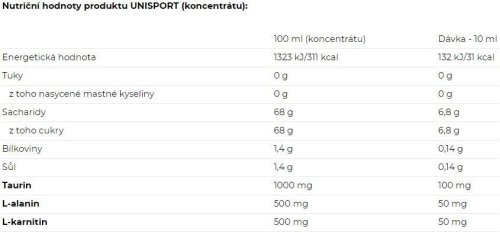 Tekutý koncentrát na prípravu hypotonického športového nápoja, s obsahom L-karnitínu, L-alanínu a taurínu. Nápoj je ľahko mineralizovaný, umožňuje teda kvalitné doplňovanie pitného režimu kedykoľvek počas dňa. Je vhodný pred fyzickou aktivitou, počas nej aj po jej skončení. - hypotonický nápoj - až 70 litrov nápoja z 1 litra koncentrátu - 7 g sacharidov v jednej dávke - L-karnitín - L-alanín - taurín - tekutý koncentrát - Nutričné hodnoty viď obrázky Odporúčané dávkovanie: 10 ml koncentrátu do 600 - 700 ml vody. Maximálne 50 ml koncentrátu za deň. Na prípravu nepoužívajte minerálne vody z dôvodu narušenia osmolality nápoja a minerálnej rovnováhy. Neprekračujte odporúčané dávkovanie. Použitie: na presnú prípravu nápoja použiť priloženú odmerku. Hotový nápoj nikdy neskladovať dlhšie ako 24 hodín. Po otvorení uchovávať pri teplote do 25 °C a spotrebovať do 3 mesiacov. Zloženie: Príchuť lesná jahoda: cukor, voda, regulátor kyslosti kyselina citrónová, aróma, chlorid sodný, glukonát horečnatý, taurín, L-karnitín, L-alanín, sladidlo acesulfam K, fosforečnan monodraselný, sladidlo sukralóza, farbivo E-1 ovplyvňovať činnosť a pozornosť detí, konzervanty sorban draselný a benzoát sodný. Príchuť ananás: cukor, voda, emulzia ananás (aróma, farbivá E-102 a E-110 - môžu nepriaznivo ovplyvňovať činnosť a pozornosť detí), regulátor kyslosti kyselina citrónová, chlorid sodný, glukonát horečnatý, taurín, L-karnitín, L-alanín , sladidlo acesulfám K, fosforečnan monodraselný, sladidlo sukralóza, konzervanty sorban draselný a benzoát sodný. Príchuť citrón: cukor, voda, emulzia citrón (slnečnicový olej, aróma, farbivo E-161b), regulátor kyslosti kyselina citrónová, chlorid sodný, glukonát horečnatý, taurín, L-karnitín, L-alanín, sladidlo acesulfam K, fosforečna sukralóza, konzervanty sorban draselný a benzoát sodný. Príchuť pomaranč: cukor, voda, regulátor kyslosti kyselina citrónová, emulzia pomaranč (slnečnicový olej, aróma, farbivá E-160a, E-160e, E-161b), chlorid sodný, glukonát horečnatý, taurín, L-karnitín, L-alan sladidlo acesulfám K, fosforečnan monodraselný, sladidlo sukralóza, konzervanty sorban draselný a benzoát sodný. Príchuť broskyňa + maracuja: cukor, voda, regulátor kyslosti kyselina citrónová, chlorid sodný, glukonát horečnatý, taurín, aróma, L-karnitín, L-alanín, sladidlo acesulfám K, fosforečnan monodraselný, sladidlo sukralóza, konzervantysor E-102 – môže nepriaznivo ovplyvňovať činnosť a pozornosť detí. Príchuť pink grep: cukor, voda, regulátor kyslosti kyselina citrónová, emulzia ružový grep (aróma, farbivá E-124 a E-110 – môžu nepriaznivo ovplyvňovať činnosť a pozornosť detí), chlorid sodný, glukonát horečnatý, taurín, L-karnitín, L -alanín, sladidlo acesulfám K, fosforečnan monodraselný, sladidlo sukralóza, aróma naringin, konzervanty sorban draselný a benzoát sodný. Príchuť malina + brusnica: cukor, voda, regulátor kyslosti kyselina citrónová, aróma, chlorid sodný, glukonát horečnatý, taurín, L-karnitín, L-alanín, sladidlo acesulfam K, fosforečnan monodraselný, sladidlo sukralóza, konzervanty sorban E-122 – môže nepriaznivo ovplyvňovať činnosť a pozornosť detí. Príchuť čiernych ríbezlí: cukor, voda, regulátor kyslosti kyselina citrónová, emulzia čiernych ríbezlí (aróma, farbivá E 122- môže nepriaznivo ovplyvňovať činnosť a pozornosť detí a E 133), chlorid sodný, glukonát horečnatý, taurín, L-karnitín, L- , sladidlo acesulfám K, fosforečnan monodraselný, sladidlo sukralóza, konzervanty sorban draselný a benzoát sodný. Príchuť cherry: cukor, voda, regulátor kyslosti kyselina citrónová, aróma, chlorid sodný, glukonát horečnatý, taurín, L-karnitín, L-alanín, sladidlo acesulfam K, fosforečnan monodraselný, sladidlo sukralóza, farbivo E-122 – môže nepriaznivo ovplyvniť pozornosť detí, konzervanty sorban draselný a benzoát sodný. Príchuť mojito: cukor, voda, regulátor kyslosti kyselina citrónová, aróma, chlorid sodný, glukonát horečnatý, taurín, L-karnitín, L-alanín, sladidlo acesulfam K, fosforečnan monodraselný, sladidlo sukralóza, konzervanty sorban draselný a benran 104 – môže nepriaznivo ovplyvňovať činnosť a pozornosť detí a E-133. Upozornenie: Koncentrát na prípravu ochuteného nealkoholického obohateného nápoja, s cukrom a sladidlami. Nenahrádza pestrú stravu. Nie je určené pre deti a tehotné alebo dojčiace ženy. Ukladajte mimo dosahu detí! Výrobca neručí za prípadné škody vzniknuté nevhodným použitím alebo skladovaním. Skladujte v suchu pri teplote do 25 ° C mimo dosahu priameho slnečného žiarenia, chráňte pred mrazom. Dodávateľ: NUTREND DS ., as ., Chválkovice 604, 779 00 Olomouc, Česká republika