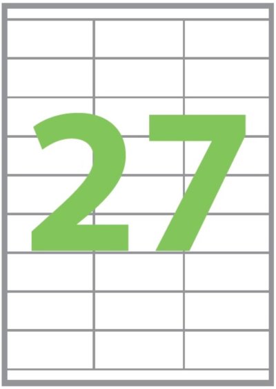Klasické samolepiace etikety vhodné pre laserové tlačiarne, atramentové tlačiarne a kopírky Veľkosť štítku: 70 x 30 mm Počet štítkov na list: 27 Gramáž: 70 g/m2 CIE belosť: 150 QCT - Quatro Clean Technology …