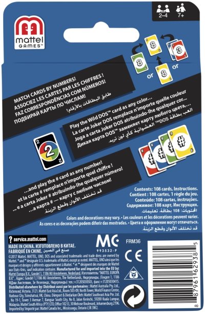 Tvorcovia kartovej hry UNO™ už dlho veria, že dvaja sú lepší ako jeden, a teraz už vám svoju myšlienku predstavujú oficiálne! Pokiaľ vás baví klasická hra UNO™, potom si UNO™ DOS zamilujete! Vo svojej obľúbenej hre UNO™ sa snažíte vy alebo váš tím ako prvý nazbierať 500 bodov, ktoré dostávate, keď sa vám podarí najrýchlejšie zo všetkých zbaviť sa všetkých kariet, ktoré máte v ruke. Vďaka akčným kartám navyše môžete hru sťažiť svojim súperom. Táto verzia obľúbenej kartovej hry však prináša zmenu v pravidlách! Pokiaľ budete mať v ruke posledné dve karty, nezabudnite vykríknuť „Dos!“ Vyskúšajte túto rodinnú hru a hneď pochopíte, prečo je už toľko rokov obľúbená. Hra je zabalená v úložnej krabičke a jej súčasťou je 108 kariet a herný návod. Je určená pre 2 - 4 hráčov starších ako 7 rokov.