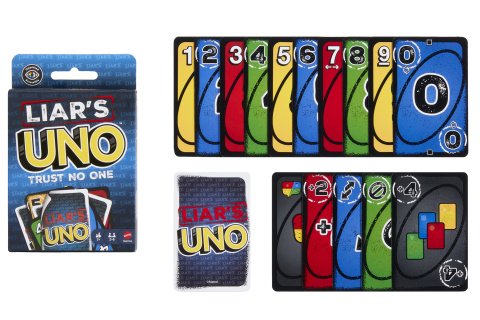 Fanúšikovia hry UNO si zamilujú túto zábavnú obmenu klasickej kartovej hry, kde lietajú klamstvá a vyhrávajú tí, ktorí vedia blafovať! Špeciálna karta sa zahrá lícom dole a hráč oznámi, čo to je. Hovorí pravdu, alebo klame? Pokiaľ ho niekto vyzve a odhalí lož, musí si vziať kartu. Ale ak hovoril pravdu, kartu si berie ten, kto ho vyzval. Udržte kamennú tvár a nezabudnite pri poslednej karte vykríknuť „UNO“! Skvelý darček pre milovníkov kartových hier od 7 rokov. Farby a vzhľad výrobku sa môžu líšiť.? Odporúčaný vek 7+