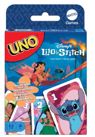 Fanúšikovia príbehov Lilo a Stitch si zamilujú túto tematickú UNO kartovú hru. S balíčkom kariet, inšpirovaným obľúbenými postavami a scénami z Lilo a Stitch, sa hráči snažia spojiť farby a čísla ako v klasickej hre UNO. Nechýba ani špeciálna karta s pravidlom „Ohana“, ktoré znamená, že každý hráč bude mať v ruke štyri karty! A keď vám zostane posledná karta, nezabudnite zakričať "UNO!"