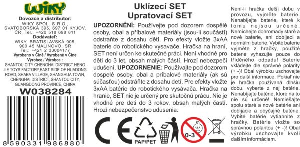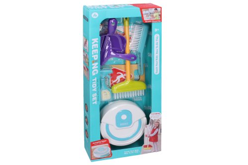Upratovací set. Obsahuje robotický vysávač 17cm, metličku, lopatku so metličkou, stierku, fľaštičku s rozprašovačom, ceduľu pozor mokrá podlaha, kartičku s nálepkami. Batérie 3xAA nie sú súčasťou.