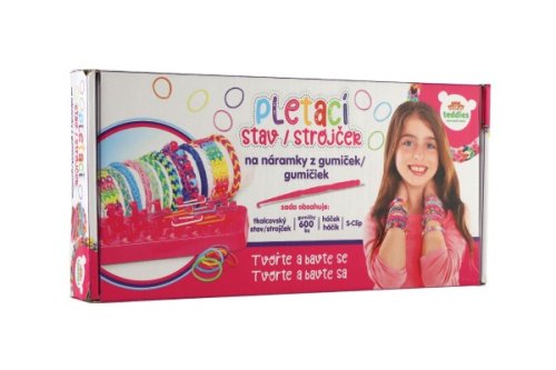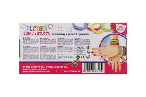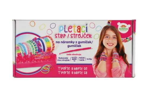 Tkáčsky stav na splietanie gumičiek môžu deti využiť na výrobu náramkov, gumičiek do vlasov alebo napríklad originálnej kľúčenky. Vyrobiť si môžu náramok v obľúbenej farebnej kombinácii alebo ho venovať kamarátovi či kamarátke. Fantázii sa medze nekladú. Splietanie gumičiek rozvíja sústredenie, predstavivosť a trénuje manuálnu zručnosť. Balenie obsahuje: 600 ks silikónových gumičiek rôznych farieb, trojradový tkáčsky stav, háčik na prevliekanie, uzávery a návod. Rozmer krabičky: 27 x 13 x 4 cm Vhodné od 3 rokov