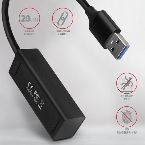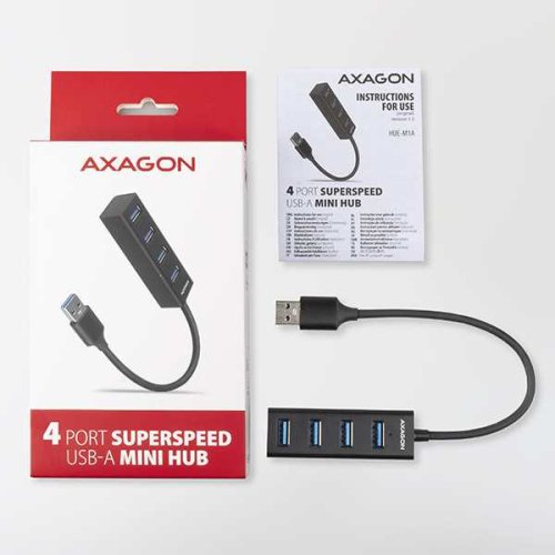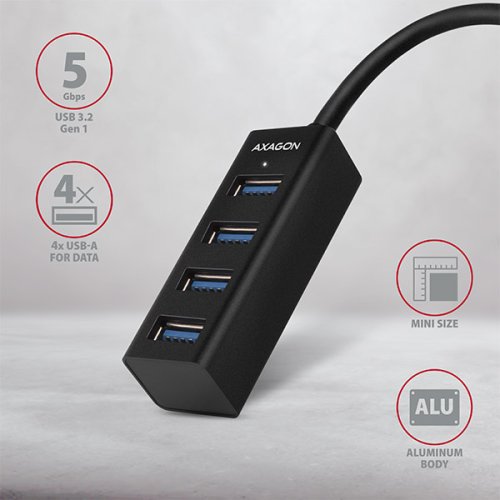 Miniatúrny kovový USB 3.2 Gen 1 (USB 3.0) húb AXAGON HUE-M1A ľahko a rýchlo pripojí k notebooku alebo počítaču až štyri USB zariadenia súčasne. Kovové telo hubu je vyrobené z hliníka a zaisťuje tak dokonalú mechanickú ochranu pre časté prenášanie. Elegantný, jemne štruktúrovaný povrch bráni nežiaducim odtlačkom. Gumové nôžky zabraňujú kĺzaniu hubu po stole. Napevno uchytený USB kábel dĺžky 20 cm je ideálny pre užívateľov mobilných zariadení.
