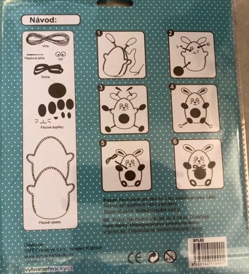 Balenie obsahuje: Vlnu, oči, plastovú ihlu, stuhu, filcové doplnky, filcové výseky. Vhodné pre deti od 6 rokov.