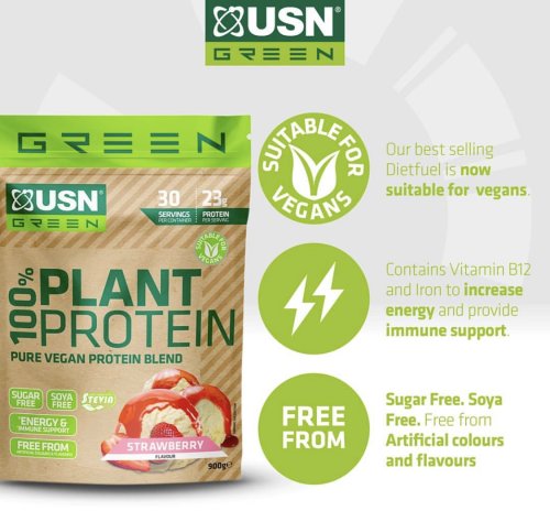USN 100% Plant Protein je zmes na prípravu proteínového nápoja. Tento nápoj je unikátny vo svojom zložení, je totiž zložený iba z látok rastlinného pôvodu, a preto je vhodný aj pre vegánov. Na zvýšenie energie a podporu imunitného systému a na udržanie normálnej funkcie nervovej sústavy obsahuje vitamín B12 a železo. Dodajte svojmu telu 23 g rastlinného proteínu pred tréningom, po tréningu alebo kedykoľvek v priebehu dňa.