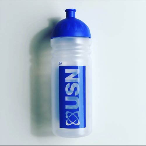 Plastová športová fľaša čírej farby s modrou potlačou loga USN.