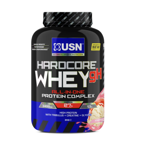 USN Hardcore whey gH je vhodným na regeneráciu a rast svalov. Má vysoký obsah bielkovín 81 g na 100 g. Tiež sacharidy, ktoré prispievajú k obnoveniu normálnej svalovej funkcie po vysoko intenzívnom alebo dlhom fyzickom tréningu vedúcej k svalovej únave a vyčerpaniu zásob glykogénu vo svaloch. Ďalej kreatín, ktorý zvyšuje fyzický výkon počas intenzívneho tréningu. Obsahuje aj Tribulus a Glycín. V jednej dávke dodáte telu 27 g proteínu. Bez obsahu lepku. Odporúčané dávkovanie: