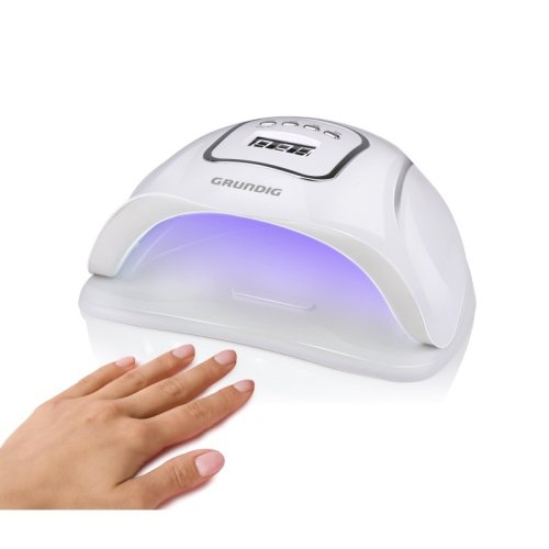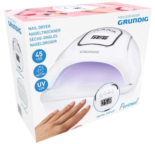 Nechty ako v salóne - sušička na nechty zaisťuje rovnomerný a hladký povrch gélového laku na nechty, podobne ako v nechtovom štúdiu. Radosť po celé týždne - so správnou prípravou na nechty zostane gélový lak na nechty bez problémov krásny po celé týždne! Za minútu uschnú - vďaka sušeniu UV lampou na nechty schne vrstva gélového laku na nechty už za minútu. Krásne a pestované nechty behom niekoľkých minút vďaka tejto UV lampe na nechty od Grundig – to je to, čo chce každý, že? Zatiaľ čo bežný lak na nechty potrebuje čas na sušenie na vzduchu a už po niekoľkých dňoch sa odlupuje, u gélových lakov na nechty je to iné. Polyméry v Shellac vytvrdzujú pod vplyvom UV svetla, čo nie je pri bežnom laku na nechty. Bežný Shellac na vzduchu nezasychá a na sušenie vyžaduje UV svetlo. Čo dostanete na oplátku? Krásne nechty, ktoré sa neodlupujú a pri správnej príprave vydržia až 2 týždne . Špecifikácia Grundig UV lampa pre gélové nechtySpotreba prúdu: 12 WDĺžka kábla: 115 cm