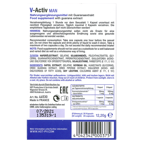 V-activ tablety ablety obsahujú prírodné látky na zvýšenie potencie. Dávkovanie: 1hod. pred pohlavným stykom (maximálne 2 tablety denne) Obsah: 20 kapsúl