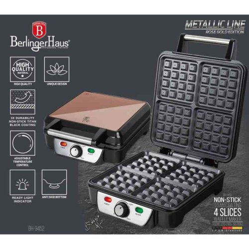 - príkon: 1100W- napätie: 220-240 V, 50/60Hz- veľkosť plochy na pečenie: 23,9*23,9 cm (1 vafle: 11*11 cm)- nepriľnavý Titanový povrch - farba: zlatoružová- pečenie 4 vaflí naraz- kontrolky teploty a prevádzky-