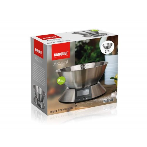 Kuchynská digitálna váha AKCENT. Mžnosti váženia: suché potraviny: g, fl. Oz, lb: oz, ml. Váha je opatrená automatickým vypnutím, možnosťou dovažovania, indikátorom slabej batérie a preťaženia.