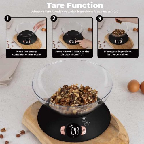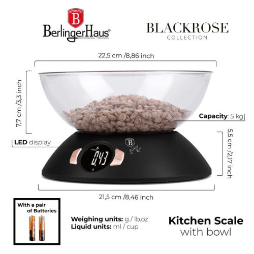S kuchynskou váhou Berlingerhaus BH-9620 môžete pripraviť zdravé a chutné pokrmy rýchlo a efektívne. Vďaka kvalitnému materiálu a modernému dizajnu je čistenie ľahké a rýchle. Táto váha je multifunkčná, takže s ňou môžete vykonávať mnoho úloh a vždy dosiahnete tie najlepšie výsledky.