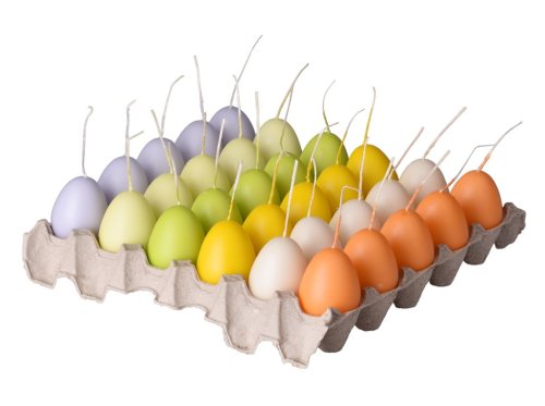 Dekoratívna sviečka v tvare vajíčka o rozmere 45×55 mm, umiestnená na plate. Prevedenie je dodávané v mixe, jednotlivé kusy sa môžu líšiť farbou alebo odtieňom.