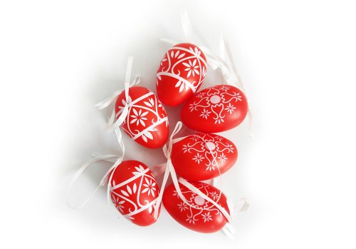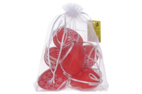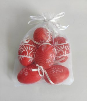 Vajíčko dekoračné plastové červené o veľkosti 6 cm. 6ks v organza sáčku. Cena za jeden organza sáčok.