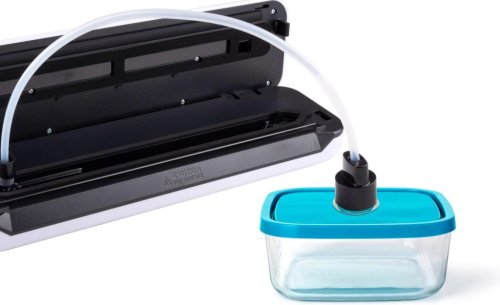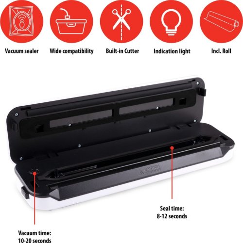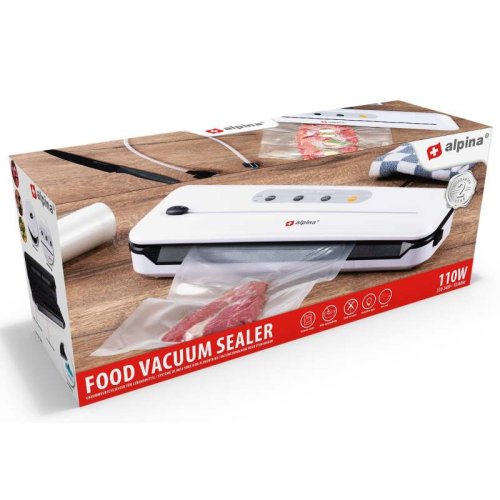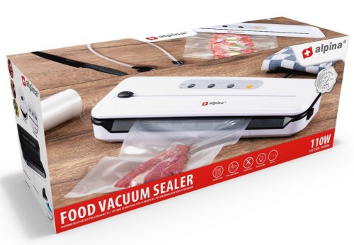 Kompaktný a výkonný. Tento šikovný a atraktívny vákuovač nasaje až 97% vzduchu zo špeciálnych vákuových vrecúšok a potom ich automaticky zataví pevným švom. Vákuové tesnenie predĺži trvanlivosť potravín trikrát až päťkrát – preto by táto praktická pomôcka nemala chýbať v žiadnej domá cnosti. S vákuovačkou dostanete aj rolu vákuovacej fólie s rozmermi 20 x 200 centimetrov. Samotné zariadenie sa ľahko ovláda pomocou dotykových tlačidiel hore. Vstavaný rezací mechanizmus môžete ovládať posuvníkom na zariadení. Vďaka tomu môžete vákuové vrecká narezať na ľubovoľnú veľkosť jedným pohybom . Ak ste potraviny nezabalili do mrazničky dostatočne vzduchotesne, vytvoria sa ľadové kryštáliky. To odstráni vlhkosť zo mrazených potravín a spôsobí ich vysušenie. Keď potraviny vákuovo zmrazíte, zostanú vždy krásne jemné a čerstvé. Pretože bol z vrecúšok s jedlom odstránený všetok vzduch, máte tiež viac miesta v mrazničke alebo chladničke. Vákuovo uzavreté vrecká môžete ľahko rozmraziť v teplej vode alebo v mikrovlnnej rúre. Vrecká si nastriháte na mieru sami, aby ste nikdy nespotrebovali viac plastu, než potrebujete . S vákuovačkou Alpina môžete vákuovo zataviť všetky druhy potravín, surové aj pripravené. Využijete ho na mäso, ryby, hydinu, zeleninu, bylinky, chlieb, zvyšky jedál atď. Funkcia: Vákuov é tesnenie potravín Integrovaný rezák : 220…240 V~, 50/60 HzVýkon: 110WFarba biela