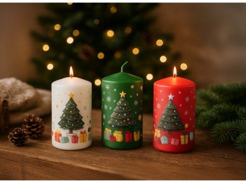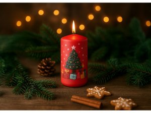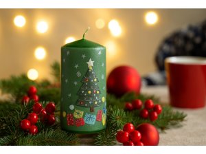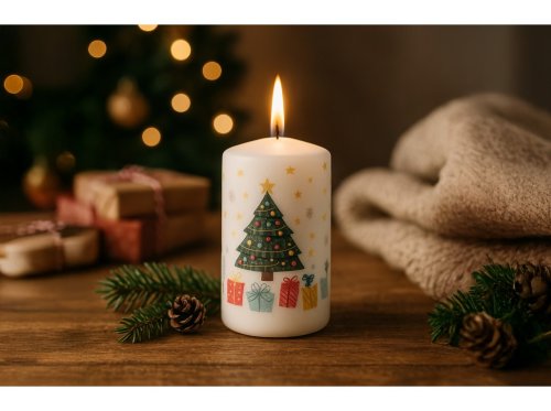 Valec o rozmere 60×110 mm s motívom stromčekov a darčekov je dekoratívna vonná sviečka, ktorá vnesie do vášho domova slávnostnú atmosféru. Vyrobená z kvalitného vosku, poskytuje teplé svetlo a štýlovú dekoráciu vhodnú pre stoly, adventné vence alebo ako samostatný doplnok.
