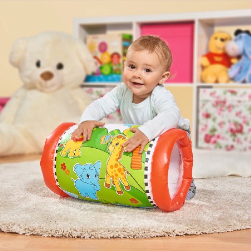Nafukovací valec s potlačou zvieratiek, zo strán priehľadný, vo vnútri 2 hrkajúce guličky. Rozmery cca 44 x 25 cm.