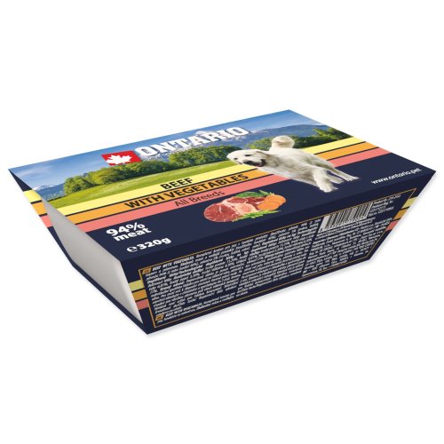 Zloženie: mäso a vedľajšie produkty živočíšneho pôvodu 94% (z toho hovädzie 40%), zelenina 5% (mrkva, hrášok, zeler).