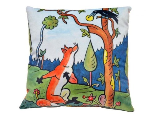 Mäkučký vankúšik s motívom bájky "O líške, vrane a syre" podľa predlohy Jozefa Lady. Vhodný do postieľky, na cesty aj ako dekorácia do izbičky. Materiál mikrovelúr, obrázok tlač, náplň duté vlákno. Zadná strana oranžová. Pre deti bez obmedzenia veku.