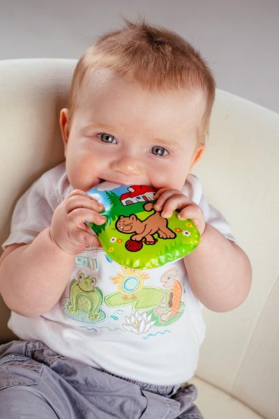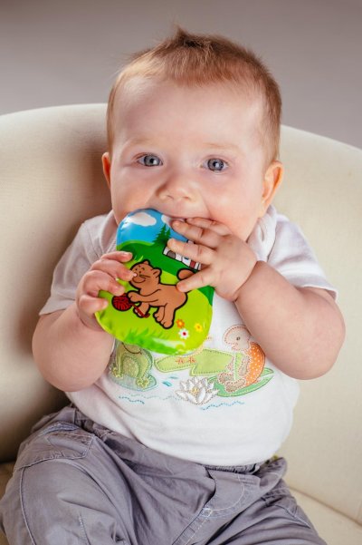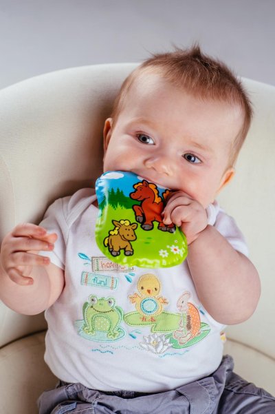 Pískací vankúšik pre najmenších s obrázkami zvieratiek. Je vhodný pre deti od 0 rokov, je bez ftalátov a riadne certifikovaný.
