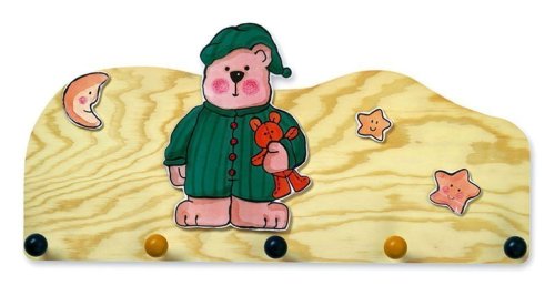 Vešiak s piatimi háčikmi, medvedík v pyžame na prírodnej drevenej doske, rozmery: 60x5x29,5 cm