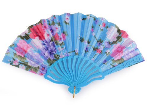 Textilný vejár zdobí potlač kvetov. Využijete ho na spoločenské udalosti, na karnevaly aj rôzne tanečné vystúpenia. Rukoväť je plastová s pútkom. Vejár je ideálny pre horúce letné dni, kedy potrebujete rýchle osvieženie, stane sa vašim obľúbeným spoločníkom pri každej príležitosti.