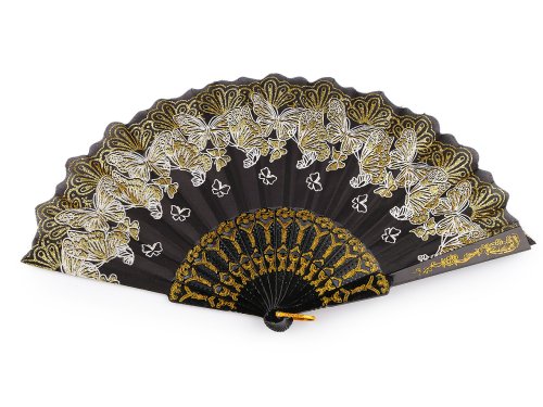 Textilný vejár zdobí potlač motýľov, ktorá je doplnená trblietavými glitrami. Využijete ho na spoločenské udalosti, na karnevaly aj rôzne tanečné vystúpenia. Rukoväť je plastová s pútkom. Vejár sa môže stať elegantným doplnkom na večerné prechádzky alebo dovolenku v exotických destináciách. Je nielen módnym doplnkom, ale aj praktickým pomocníkom v horúcich letných dňoch. Prinesie vám príjemné osvieženie a zvýrazní váš osobný štýl.