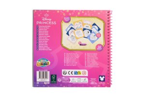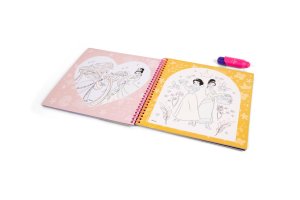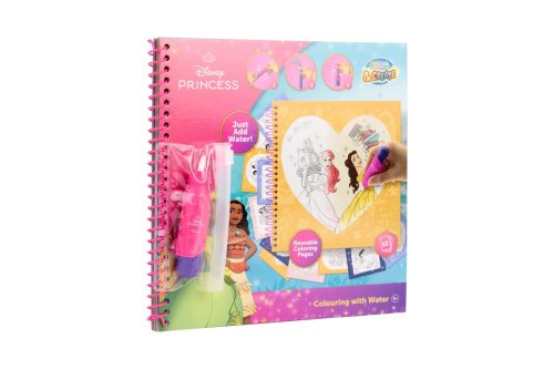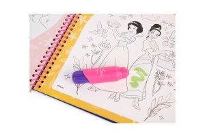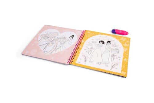 Kúzelná omaľovánková kniha s motívmi Disney princezien, ktorá funguje na princípe vodného maľovania. Stačí iba naplniť priložený štetec vodou a pretrieť obrázok – farby sa samy objavia a vykúzlia nádhernú ilustráciu. Opakovane použiteľná (po zaschnutí farby opäť zmizne a je možné maľovať znova). Praktický formát 22,5 × 22,5 cm, ideálny na cesty aj domáce tvorenie.