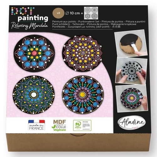 Kreatívna súprava obsahuje všetko potrebné pre veľké bodkovacie tvorenie! Nájdete v nej 8 okrúhlych drevených výrezov, ktoré nafarbíte na čierno pomocou plochého štetca a podkladovej farby. Po zaschnutí na výrez priložte jednu zo 4 plastových šablón s guľatými otvormi. V balení je ďalej mikroceruzka, s ktorou sa všetky otvory šablóny prekreslia – vďaka nim budete vedieť, kde na výreze urobiť aké veľké bodky. Teraz si stačí otvoriť 8 priložených farbičiek a môžete bodkovať! Pre veľké bodky využite akrylové tyčinky, pre malé bodky nástroje s kovovými guličkami. Môžete nasledovať vzory na balení alebo bodkovať podľa vlastnej fantázie. Šablóny je možné používať opakovane, je možné dokúpiť ďalšie drevené výrezy (zn. Gomille). MDF pochádza z ekologicky získaného zvyškového dreva.