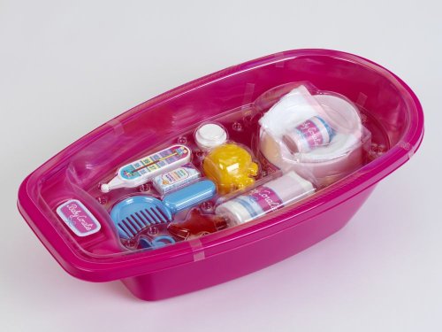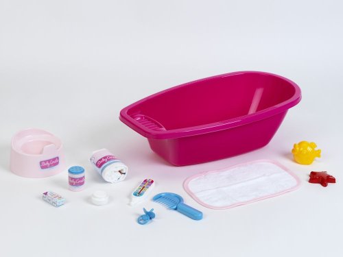 Veľká vanička pre bábiky s príslušenstvom 12 kusov, ktoré potrebuje mamička na starostlivosť o svoje bábätko. Pre bábiku o veľkosti max 50 cm. Vhodné pre deti od 3 rokov.
