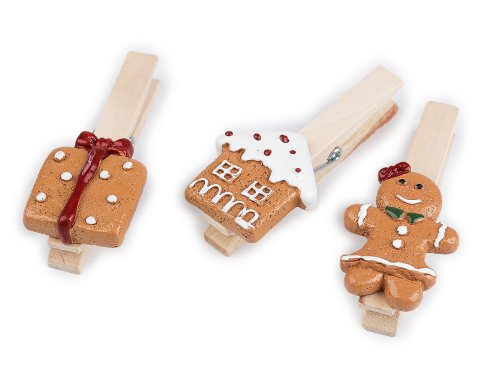 Súprava troch vianočných kolíčkov s motívom perníčkov je vhodná na rôzne dekoratívne účely. Kolíčky štýlovo ozdobia vianočné darčeky, vrecká, tašky alebo kvetináče a kvetinové väzby.