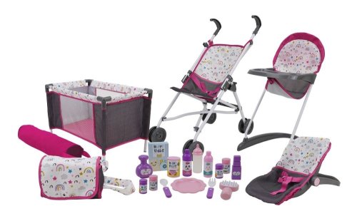 Veľký herný set potrieb pre bábiky vhodné do cca. 46 cm. Súprava obsahuje 21 kusov. Pre deti od 3 rokov. • Kočík pre bábiky (madlo nie je posúvacie a výška madla od zeme je cca 54,5 cm) • Vysoká stolička pre bábiky s jedálenskou táckou • Autosedačka pre bábiky 2 v 1. Autosedačku je možné premeniť na stoličku na kŕmenie. • Cestovnú postieľku pre bábiky s taškou • Taška na príslušenstvo • 15 ks príslušenstva