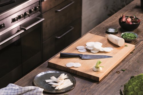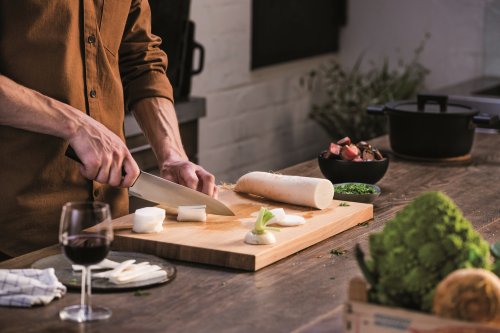 Veľký univerzálny nôž je ideálny na krájanie veľkých kusov potravín. Čepeľ noža je zo silnej nerezovej oceľovej planžety. Ostrie je zhotovené revolučnou technológiou LZR-EDGE. Tá umožňuje, aby nôž zostal ostrý 4-krát dlhšie ako štandardné nože. Držadlo noža je ergonomicky tvarované s jedinečným 3D vzorom, ktorý zaisťuje perfektné držanie. Výška: 420 mm, dĺžka: 25 mm, šírka: 90 mm, hmotnosť: 110 g.