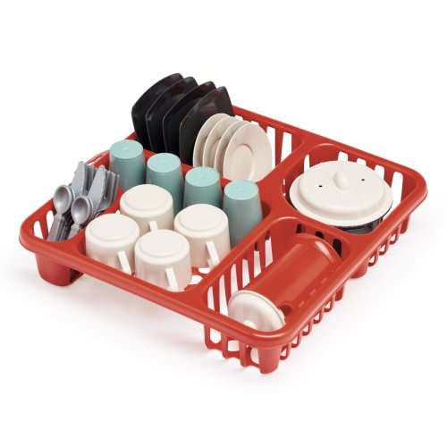 Veľká sada riadu s odkvapkávačom obsahuje hrnčeky, príbory, taniere, hrniec s pokrievkou, kanvičku s pokrievkou a šálky s podšálkami. Rozmery odkvapkávača 29,5 x 10 x 29 cm. Vek: 18M+