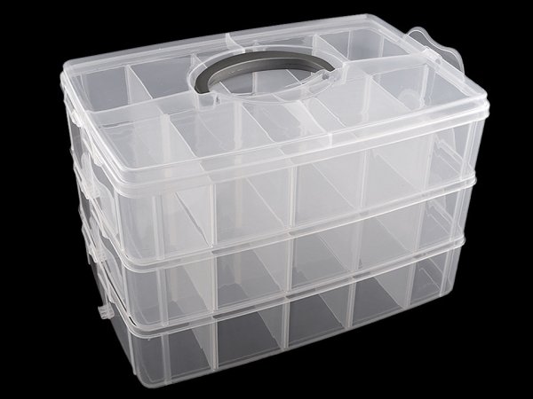 Trojposchodový rozkladací zásobník sa hodí na skladovanie komponentov pre kreatívnu tvorbu. Každý zásobník je vekom toho spodného, s ktorým sa spojí sponou na boku zásobníka. Vrchné poschodie má odnímateľné veko s uchom na prenášanie. Tiež sa zatvára na sponu. Dovnútra je vidieť vďaka priehľadnému plastu. Priehradky si môžete regulovať pomocou odstrániteľných prepážok (1 x dlhá vcelku, 8 x krátke jednotlivé), pokiaľ odstránite všetky, budete mať celé poschodie voľné o priestore 18 x 31 x 8 cm. Pokiaľ použijete všetky prepážky, veľkosť malých priehradiek, ktorých bude 10 ks na jednom poschodí, bude 6 x 9 cm. Hĺbka priehradky je 7 cm. Na každom poschodí je to rovnaké, poradie poschodí môžete meniť.
