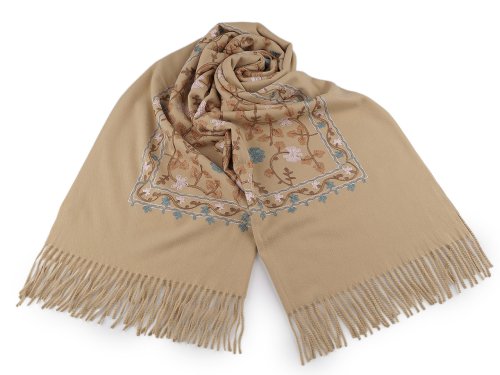 Velký teplý šátek typu kašmír je elegantním módním doplňkem, který zaujme svou nádhernou výšivkou. Je velice kvalitní, komfortně vás zahřeje v sychravých dnech. Je vyrobený z materiálu příjemně hebkého na dotek. Na koncích je zakončený dlouhými třásněmi. Můžete jej nosit do práce i do společnosti, výšivka má jemný lesk, elegantně dozdobí váš outfit. Upozorňujeme zákazníky, že složení na štítcích se může lišit, materiál je viskóza a polyester.
