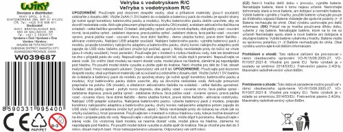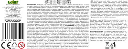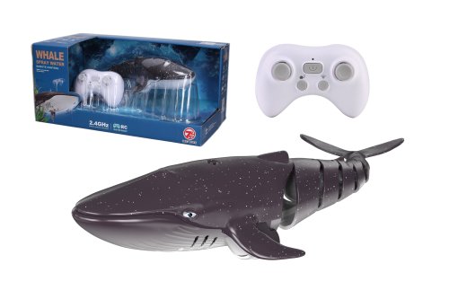 Veľryba striekajúcej vodu RC na diaľkové ovládanie. Rozmery 35x12x8 cm. Frekvencia 2.4GHz. Svetelné efekty. 3.7V batériový pack do veľryby súčastí, 2xAA do ovládača nie sú súčasťou. USB adaptér súčasťou. Ovládač - tlačidlo ON/OFF, ľavé okrúhle tlačidlo - demo režim, pravé okrúhle tlačidlo - vodotrysk. Senzory na vodu na spodnej strane veľryby.