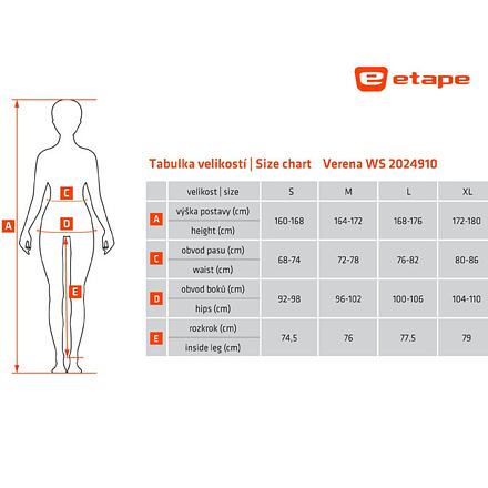 Športové nohavice ETAPE Verena WS sú ideálnou voľbou pre ženy, ktoré hľadajú pohodlné a funkčné nohavice na cyklistiku, behanie alebo len bežné nosenie pri teplotách od -15 °C do 5 °C. Nohavice sú vyrobené z funkčného a elastického materiálu SoftShell, ktorý je odolný vetru a vode s vynikajúcimi termoizolačnými a transpiračnými vlastnosťami. Vďaka trojvrstvovej štruktúre ponúka maximálny komfort a ochranu. Navyše vďaka materiálu ThermoFit nohavice ponúkajú skvelé thermoizolačné vlastnosti, sú elastické, mäkké, príjemne na dotyk a majú antibakteriálnu úpravu. Verena WS: - materiál SoftShell s membránou a zateplením - materiál ThermoFit so zateplením - pohodlný voľný strih - elastický pás so šnúrkou na stiahnutie - 2 vrecká na zips - zipsy na nohaviciach pre pohodlné obliekanie - protišmykový silikónový pásik na nohaviciach - reflexné bezpečnostné prvky - rozsah: -15 °C až 5 °C Veľkostná tabuľka v obrázkoch. Uvedené hodnoty sú iba orientačné a vhodná veľkosť sa môže líšiť podľa konkrétneho typu postavy.