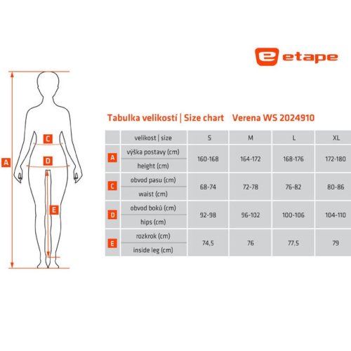 Športové nohavice ETAPE Verena WS sú ideálnou voľbou pre ženy, ktoré hľadajú pohodlné a funkčné nohavice na cyklistiku, behanie alebo len bežné nosenie pri teplotách od -15 °C do 5 °C. Nohavice sú vyrobené z funkčného a elastického materiálu SoftShell, ktorý je odolný vetru a vode s vynikajúcimi termoizolačnými a transpiračnými vlastnosťami. Vďaka trojvrstvovej štruktúre ponúka maximálny komfort a ochranu. Navyše vďaka materiálu ThermoFit nohavice ponúkajú skvelé thermoizolačné vlastnosti, sú elastické, mäkké, príjemne na dotyk a majú antibakteriálnu úpravu. Verena WS: - materiál SoftShell s membránou a zateplením - materiál ThermoFit so zateplením - pohodlný voľný strih - elastický pás so šnúrkou na stiahnutie - 2 vrecká na zips - zipsy na nohaviciach pre pohodlné obliekanie - protišmykový silikónový pásik na nohaviciach - reflexné bezpečnostné prvky - rozsah: -15 °C až 5 °C Veľkostná tabuľka v obrázkoch. Uvedené hodnoty sú iba orientačné a vhodná veľkosť sa môže líšiť podľa konkrétneho typu postavy.
