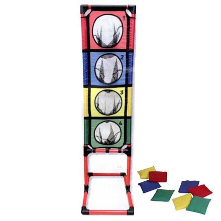 Merco Vertex Target Throw je zábavná hra pre celú rodinu, kedy je cieľom trafiť otvor tzv. bean bagom, teda vreckom vyplneným fazuľami a gumovými guličkami. Celá sada obsahuje skladací terč vyrobený z polyesteru a ľahkej PVC konštrukcie a ôsmimi farebnými vreckami. Hru môžete hrať sami a trénovať tak svoju presnosť spodného hodu, alebo hrajte s priateľmi a vytvorte si svoju súťaž o to, kto získa najviac bodov. Terč má po jednoduchom zložení rozmery približne 172 x 44 x 62 cm a hmotnosť necelé 2 kg. Pokiaľ hľadáte novú hru do školy, pre detské krúžky alebo pre svoju rodinu, Vertex Target Throw je to pravé! Upozornenie: Nie je vhodné pre deti mladšie ako 3 roky. Vždy hádžte bean bag spodkom na terč a nie plnou silou horným švihom, inak časom hrozí poškodenie terča. - materiál: PVC, polyester - 8 sáčkov na hádzanie, štyri farby - rozmery vrecka: 10 x 10 x 1,5 cm - hmotnosť vrecka: 70 g - rozmery terča: 172 x 44 x 62 cm (výška x šírka x hĺbka) - hmotnosť terča: cca 2 kg - priemer otvorov: 22 cm - jednoduché a rýchle zloženie a rozloženie na uskladnenie - rozmery balenia: 130 x 22 x 11 cm