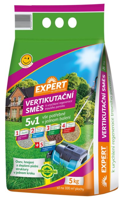 Vertikutačná zmes slúži na obnovu a regeneráciu trávneho porastu po vertikutácii. Vertikutačná zmes je vyrobená zo zeolitu, špeciálneho trávnikárskeho piesku, organického hnojiva vo forme mikrogranulátu, trávneho osiva a vododržnej zložky (pôdneho kondicionéra). Použité trávne osivo sa skladá z vybraných druhov rýchlo klíčiacich tráv, čo vedie k rýchlemu zaplneniu prázdnych miest v trávniku. Zloženie: NPK 3 - 1 - 5. Organické hnojivo dodáva vzchádzajúcemu trávnemu porastu všetky potrebné živiny a vďaka veľmi jemnej granulometrii je docielené pravidelné rozmiestnenie hnojiva, čo má priaznivý vplyv na rovnomerný rast a tvorbu koreňového systému. Tým je dosiahnutá rýchla obnova chýbajúceho trávneho porastu. Zeolit pomáha zlepšiť využitie živín z hnojiva, pretože má schopnosť pútať prebytočné živiny a následne ich postupne uvoľňovať pre potreby rastlín. Na úspešné klíčenie trávneho osiva a vzchádzanie mladých rastlín je tiež nevyhnutné zaistiť dostatok vlahy, pretože mladé vzchádzajúce rastliny sú z dôvodu nedostatočne vyvinutého koreňového systému náchylné k jej nedostatku. Z tohto dôvodu je súčasťou vertikutačnej zmesi aj vododržná zložka, ktorá má schopnosť viazať vodu v čase jej nadbytku (dažďovej zrážky, závlaha) a potom ju postupne uvoľňovať rastlinám. Tým sa zlepšuje využitie vody zo závlahy (dažďových zrážok).