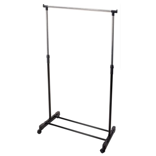 stojan na odevy jednoduchý, 4 kolieska. 1 jednoduchá závesná tyč, rám z nerezovej ocele, čierne vonkajšie a čierne tyče. tyče z nerezovej ocele na hornej strane: 19 mm. spodné tyče 16 mm. hrúbka 0,25 mm, pp diely čierne, chrómovaná závesná tyč, 2 horné rúrky. rozmery 80x43xh90-160 cm, maximálna hmotnosť na kus 10 kg.