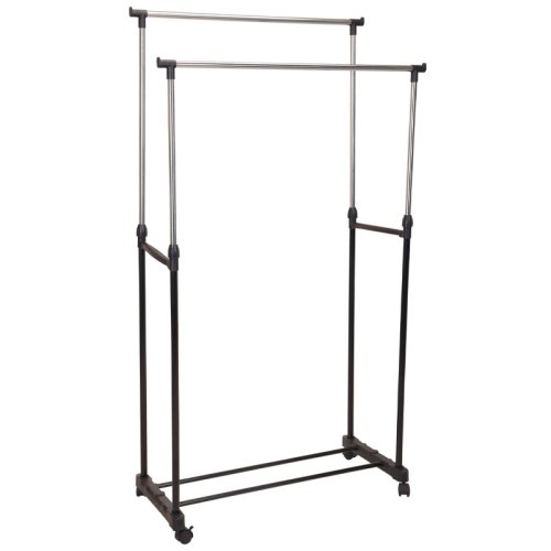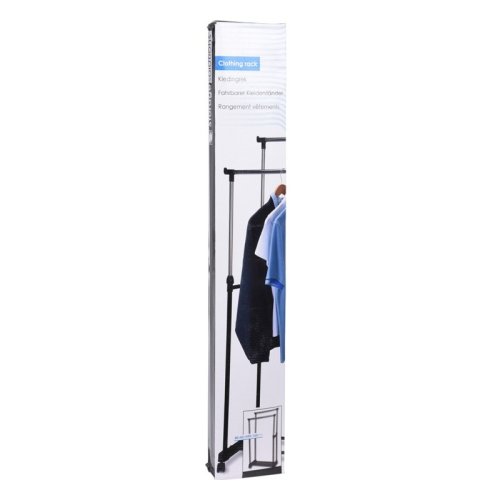 stojan na odevy na 4 kolieskach, 2 stojany so zosilnenou tyčou, kovový rám, horné tyče z nerezovej ocele 19 mm. spodné kovové tyče 16mm, hrúbka 0,25mm, čierna farba, chrómované opperbary, pp diel v čiernej vonkajšej farbe. rozmer 80x42xh90-160cm. maximálna hmotnosť položky je 15 kg. každá položka v našej dizajnovej farebnej krabičke, keď je v 6kusoch./ 120x80x765mm, farebná krabica (clb-c): , 800x420x1.650mm / cft 1,73, (8.101/40ft hq).