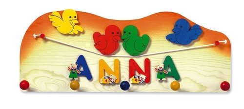 Drevený vešiak ako dekorácia do každej detskej izbičky, vo veselých farbách s obrázkami práčkov na šnúrke, s farebným nápisom s medvedíkmi, 5 úchytov, rozmery: 60x5x24 cm